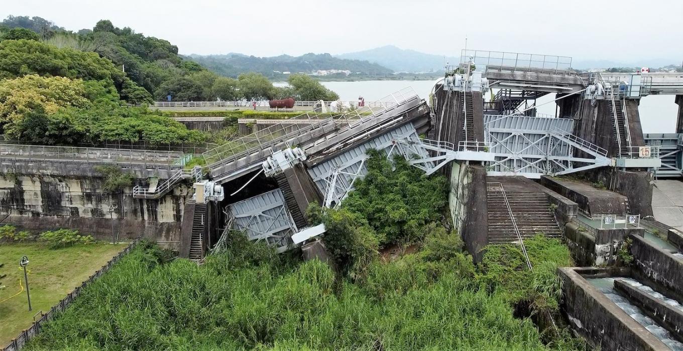 大台中地區公共給水石岡壩921震災嚴重受創 1999年921地震,造成車籠埔斷層錯動,破裂帶通過石岡壩第16號溢洪道,造成左岸隆起9.8公尺,右岸隆起2.2公尺,壩體受擠壓變形,石岡壩16、17、18號閘門及土木設施全毀,其餘閘門扭曲變形,閘門樞軸也偏移正常軌跡,閘門無法有效啟閉,造成台中地區缺水。 圖號:0512014 圖片出處:政府網站資料開放宣告 網路連結: 更新日期:2022/06/17 點選次數; 893 本商品上架日期:2022年06月17日週五.