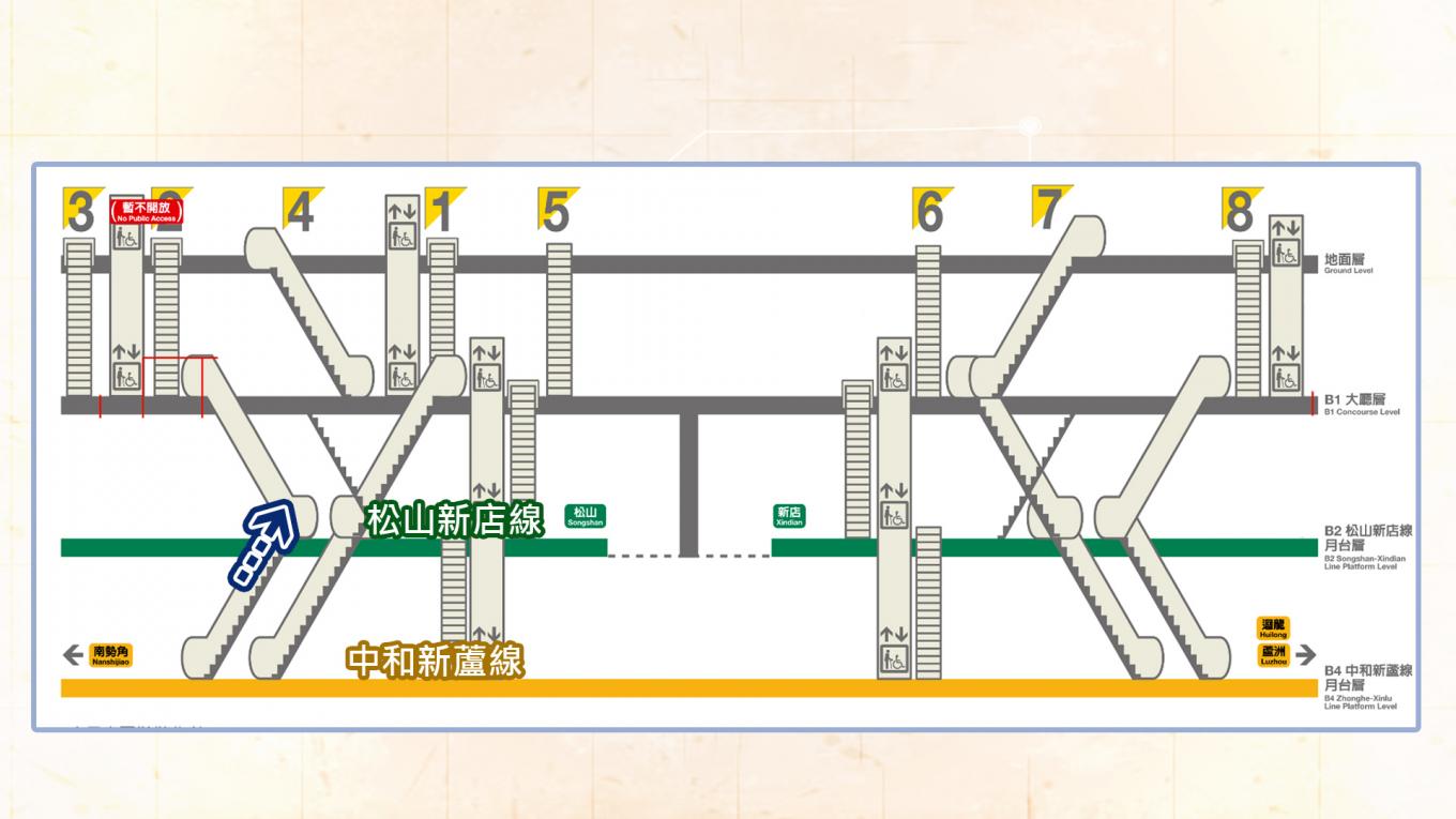 捷運中和新蘆線新莊線台北市段沿線車站-松江南京站(O08)轉乘松山新店線(G15)路線圖 中和新蘆線欲轉乘松山新店線之旅客,可搭乘手扶梯向上至松山新店線月台層轉乘。 圖號:0806173 圖片出處:日月同輝2023 網路連結: 更新日期:2023/11/14 點選次數; 240 本商品上架日期:2023年11月14日週二.